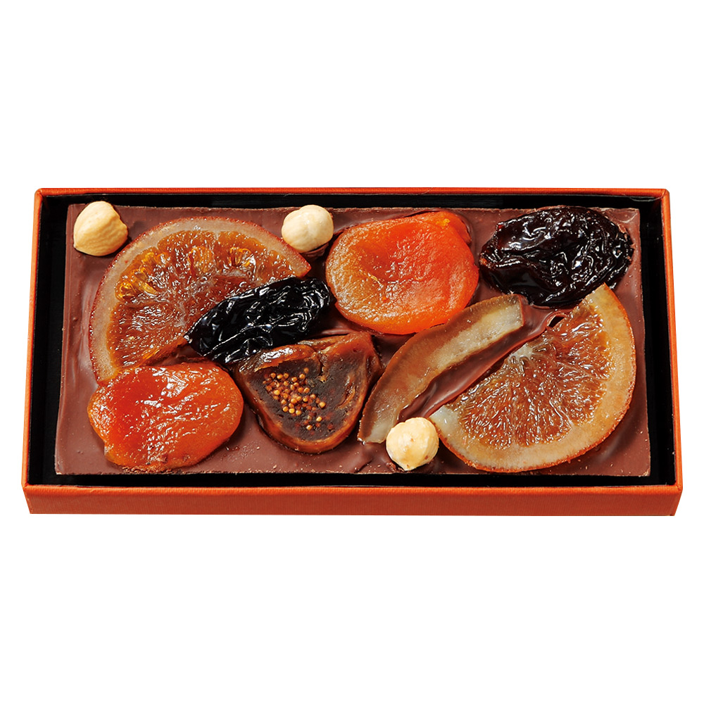 アプリコットやオレンジピール、レモン、プルーンといったドライフルーツが正方形のチョコレートに贅沢に乗せられ、それぞれのフルーツの風味がカカオの香りと絶妙にマッチします。